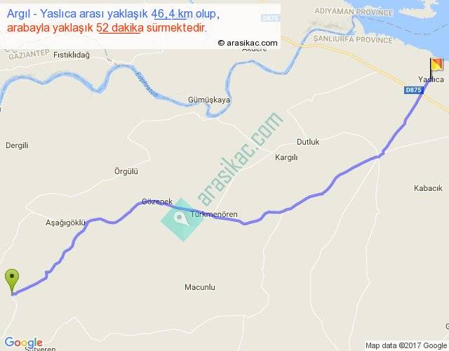 Argıl - Yaslıca arası yaklaşık olarak 90 km/h ile yukarıda belirtilen sürede olup, iki yerin kuş uçuşu uzaklığı (mesafesi) 41'dir. Yolculuk otobüsle 1 saat 7 dakika sürmektedir.