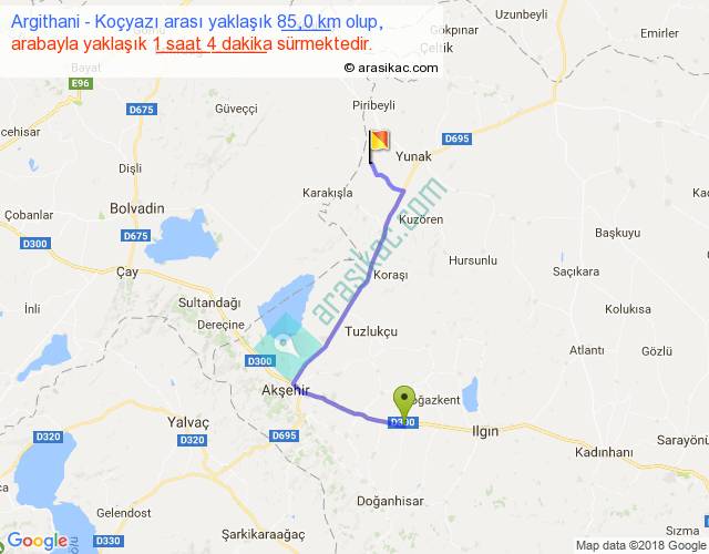 Argithani - Koçyazı arası yaklaşık olarak 90 km/h ile yukarıda belirtilen sürede olup, iki yerin kuş uçuşu uzaklığı (mesafesi) 57'dir. Yolculuk otobüsle 1 saat 23 dakika sürmektedir.