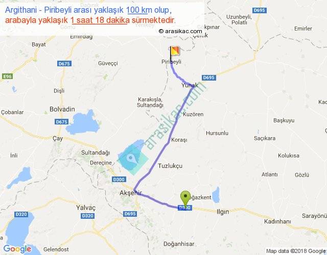 Argithani - Piribeyli arası yaklaşık olarak 90 km/h ile yukarıda belirtilen sürede olup, iki yerin kuş uçuşu uzaklığı (mesafesi) 69'dir. Yolculuk otobüsle 1 saat 41 dakika sürmektedir.
