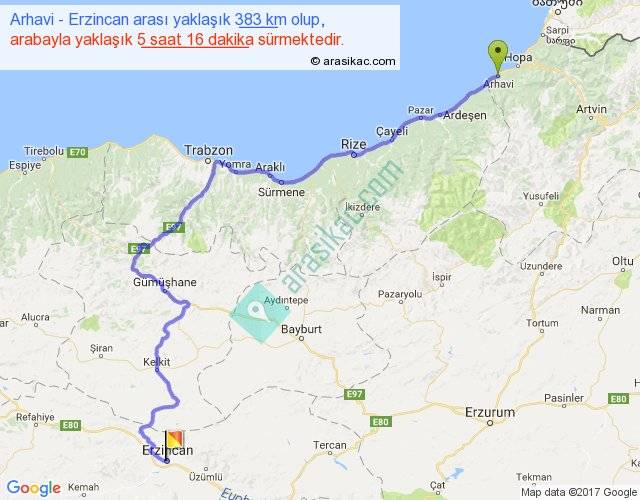 Arhavi - Erzincan arası yaklaşık olarak 90 km/h ile yukarıda belirtilen sürede olup, iki yerin kuş uçuşu uzaklığı (mesafesi) 234'dir. Yolculuk otobüsle 6 saat 50 dakika sürmektedir.