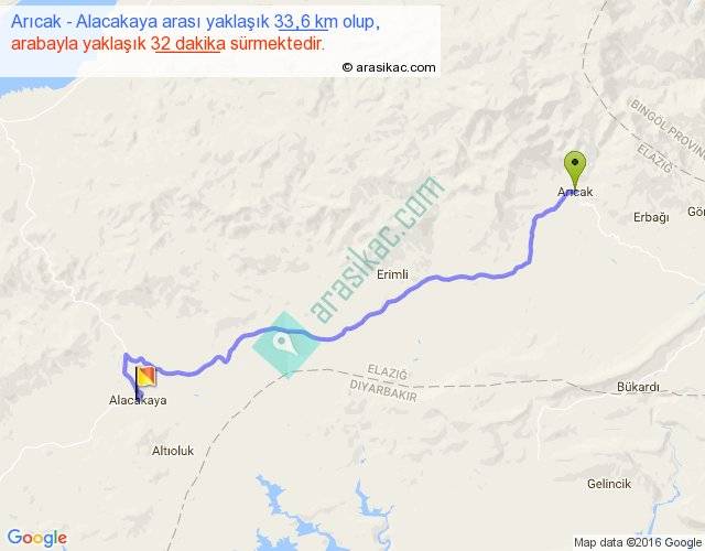 Arıcak - Alacakaya arası yaklaşık olarak 90 km/h ile yukarıda belirtilen sürede olup, iki yerin kuş uçuşu uzaklığı (mesafesi) 26'dir. Yolculuk otobüsle 41 dakika sürmektedir.