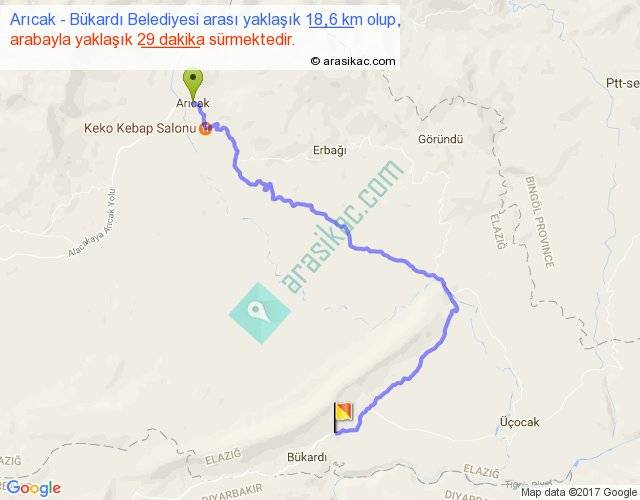 Arıcak - Bükardı Belediyesi arası yaklaşık olarak 90 km/h ile yukarıda belirtilen sürede olup, iki yerin kuş uçuşu uzaklığı (mesafesi) 11'dir. Yolculuk otobüsle 37 dakika sürmektedir.