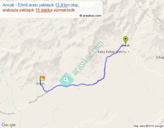 Arıcak - Erimli arası yaklaşık olarak 90 km/h ile yukarıda belirtilen sürede olup, iki yerin kuş uçuşu uzaklığı (mesafesi) 11'dir. Yolculuk otobüsle 19 dakika sürmektedir.