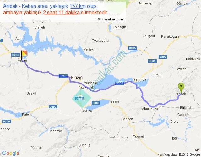 Arıcak - Keban arası yaklaşık olarak 90 km/h ile yukarıda belirtilen sürede olup, iki yerin kuş uçuşu uzaklığı (mesafesi) 123'dir. Yolculuk otobüsle 2 saat 50 dakika sürmektedir.