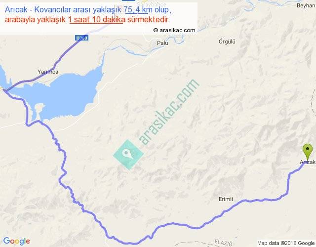 Arıcak - Kovancılar arası yaklaşık olarak 90 km/h ile yukarıda belirtilen sürede olup, iki yerin kuş uçuşu uzaklığı (mesafesi) 29'dir. Yolculuk otobüsle 1 saat 31 dakika sürmektedir.