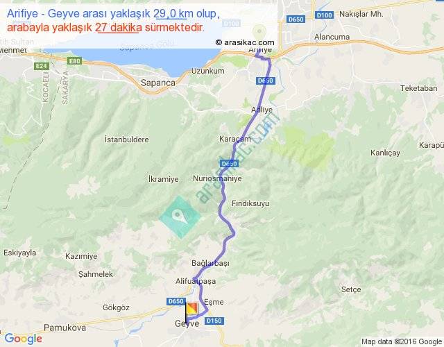 Arifiye - Geyve arası yaklaşık olarak 90 km/h ile yukarıda belirtilen sürede olup, iki yerin kuş uçuşu uzaklığı (mesafesi) 24'dir. Yolculuk otobüsle 35 dakika sürmektedir.