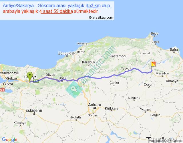 Arifiye Sakarya - Gökdere arası yaklaşık olarak 90 km/h ile yukarıda belirtilen sürede olup, iki yerin kuş uçuşu uzaklığı (mesafesi) 392'dir. Eğer belirtilen yerler arasında uçak seferi var ise bu süre uçakla 36 dakika'ya kadar düşebilir. Yolculuk otobüsle 6 saat 28 dakika sürmektedir.