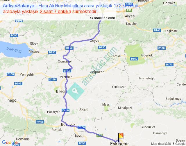 Arifiye Sakarya - Hacı Ali Bey Mahallesi arası yaklaşık olarak 90 km/h ile yukarıda belirtilen sürede olup, iki yerin kuş uçuşu uzaklığı (mesafesi) 102'dir. Yolculuk otobüsle 2 saat 45 dakika sürmektedir.
