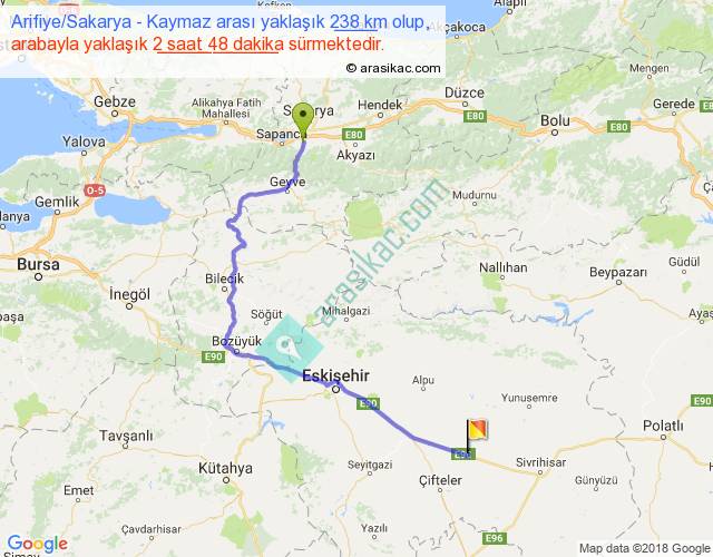 Arifiye Sakarya - Kaymaz arası yaklaşık olarak 90 km/h ile yukarıda belirtilen sürede olup, iki yerin kuş uçuşu uzaklığı (mesafesi) 147'dir. Yolculuk otobüsle 3 saat 38 dakika sürmektedir.