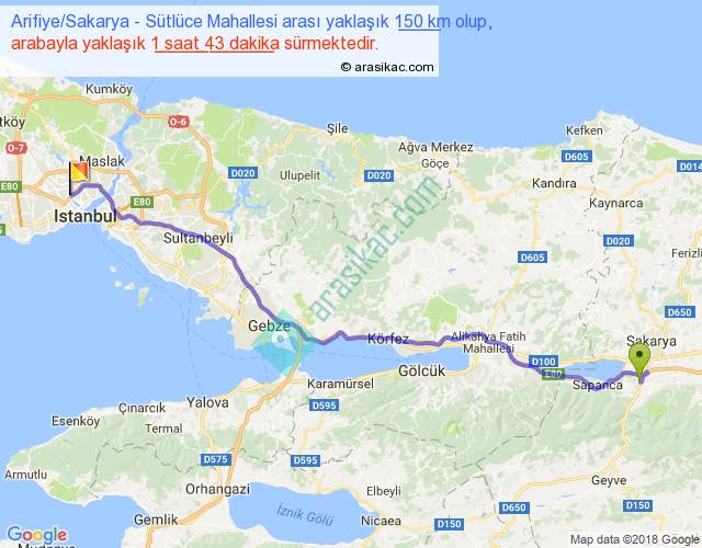 Arifiye Sakarya - Sütlüce Mahallesi arası yaklaşık olarak 90 km/h ile yukarıda belirtilen sürede olup, iki yerin kuş uçuşu uzaklığı (mesafesi) 125'dir. Yolculuk otobüsle 2 saat 13 dakika sürmektedir.