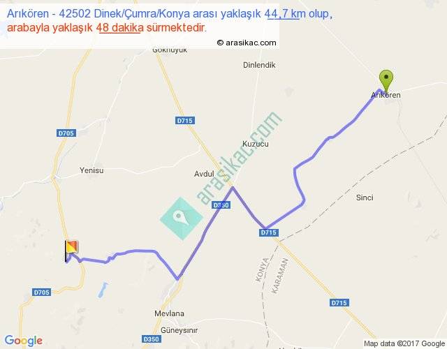 Arıkören - 42502 Dinek Çumra Konya arası yaklaşık olarak 90 km/h ile yukarıda belirtilen sürede olup, iki yerin kuş uçuşu uzaklığı (mesafesi) 31'dir. Yolculuk otobüsle 1 saat 2 dakika sürmektedir.