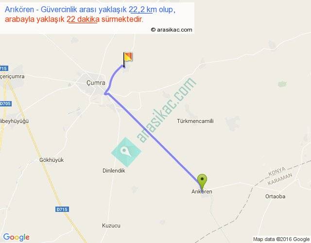 Arıkören - Güvercinlik arası yaklaşık olarak 90 km/h ile yukarıda belirtilen sürede olup, iki yerin kuş uçuşu uzaklığı (mesafesi) 18'dir. Yolculuk otobüsle 28 dakika sürmektedir.