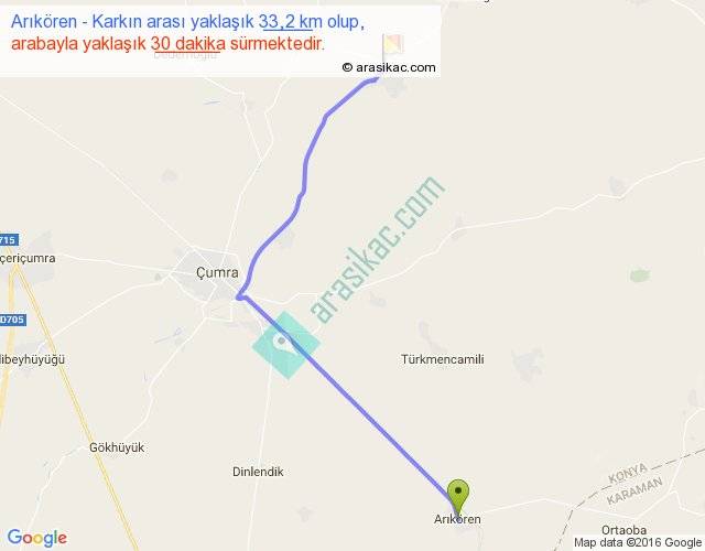 Arıkören - Karkın arası yaklaşık olarak 90 km/h ile yukarıda belirtilen sürede olup, iki yerin kuş uçuşu uzaklığı (mesafesi) 25'dir. Yolculuk otobüsle 39 dakika sürmektedir.
