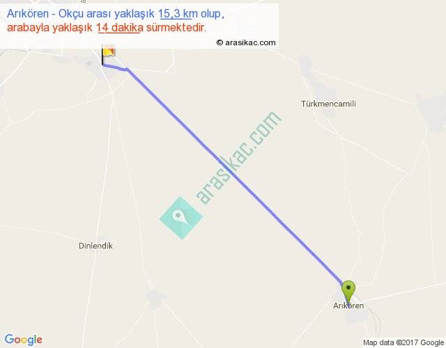 Arıkören - Okçu arası yaklaşık olarak 90 km/h ile yukarıda belirtilen sürede olup, iki yerin kuş uçuşu uzaklığı (mesafesi) 15'dir. Yolculuk otobüsle 18 dakika sürmektedir.