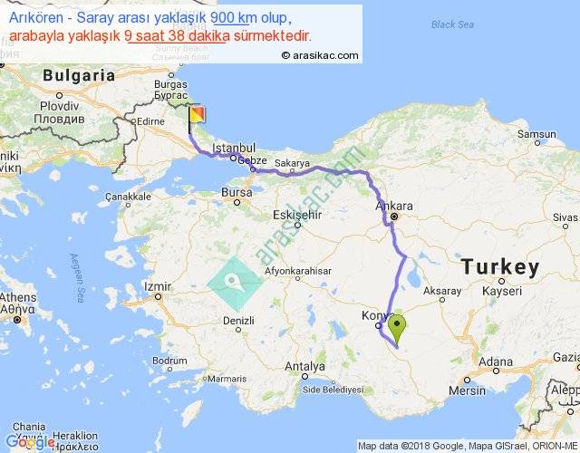 Arıkören - Saray arası yaklaşık olarak 90 km/h ile yukarıda belirtilen sürede olup, iki yerin kuş uçuşu uzaklığı (mesafesi) 614'dir. Eğer belirtilen yerler arasında uçak seferi var ise bu süre uçakla 56 dakika'ya kadar düşebilir. Yolculuk otobüsle 12 saat 31 dakika sürmektedir.