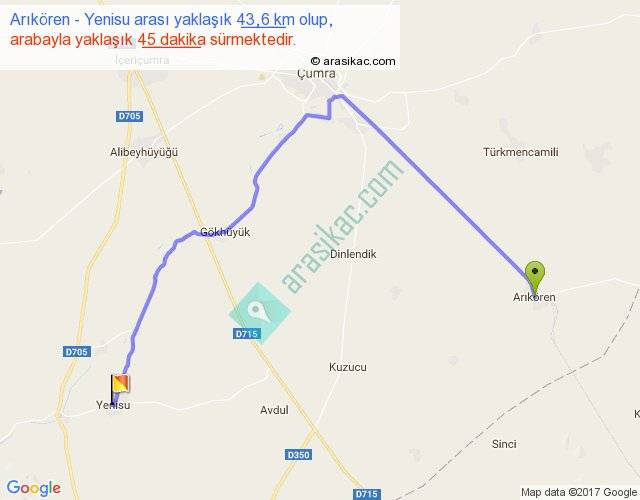 Arıkören - Yenisu arası yaklaşık olarak 90 km/h ile yukarıda belirtilen sürede olup, iki yerin kuş uçuşu uzaklığı (mesafesi) 26'dir. Yolculuk otobüsle 58 dakika sürmektedir.
