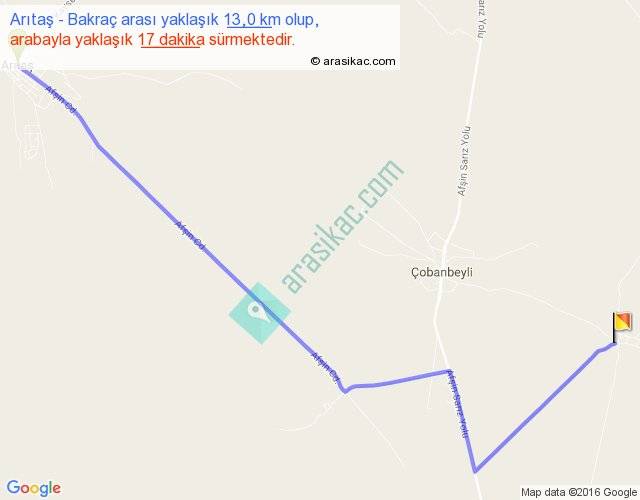 Arıtaş - Bakraç arası yaklaşık olarak 90 km/h ile yukarıda belirtilen sürede olup, iki yerin kuş uçuşu uzaklığı (mesafesi) 10'dir. Yolculuk otobüsle 22 dakika sürmektedir.