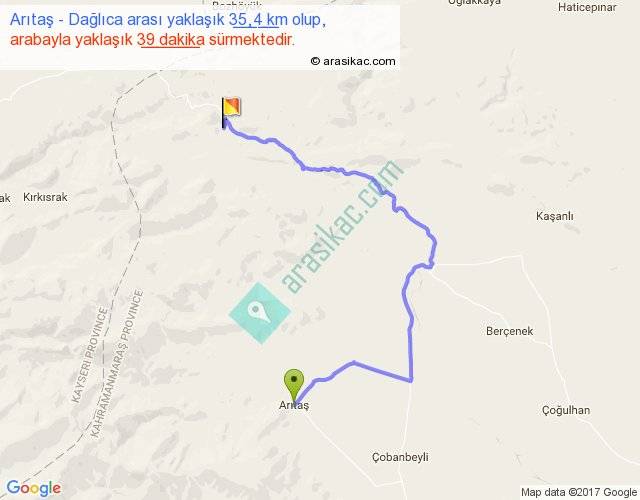 Arıtaş - Dağlıca arası yaklaşık olarak 90 km/h ile yukarıda belirtilen sürede olup, iki yerin kuş uçuşu uzaklığı (mesafesi) 17'dir. Yolculuk otobüsle 50 dakika sürmektedir.