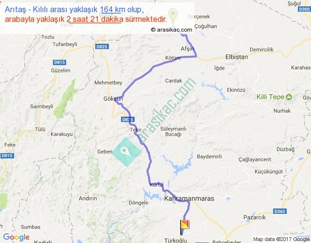 Arıtaş - Kılılı arası yaklaşık olarak 90 km/h ile yukarıda belirtilen sürede olup, iki yerin kuş uçuşu uzaklığı (mesafesi) 103'dir. Yolculuk otobüsle 3 saat 3 dakika sürmektedir.