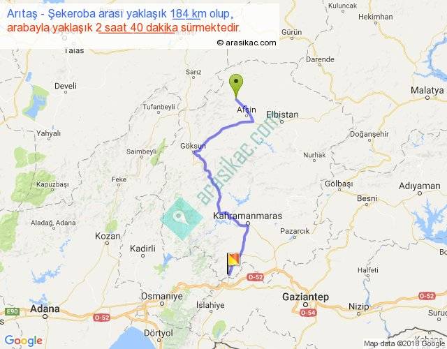 Arıtaş - Şekeroba arası yaklaşık olarak 90 km/h ile yukarıda belirtilen sürede olup, iki yerin kuş uçuşu uzaklığı (mesafesi) 120'dir. Yolculuk otobüsle 3 saat 28 dakika sürmektedir.