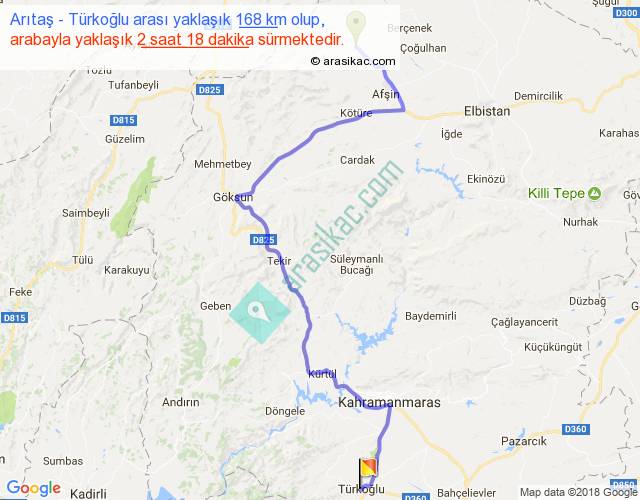 Arıtaş - Türkoğlu arası yaklaşık olarak 90 km/h ile yukarıda belirtilen sürede olup, iki yerin kuş uçuşu uzaklığı (mesafesi) 106'dir. Yolculuk otobüsle 2 saat 59 dakika sürmektedir.