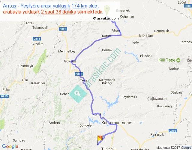 Arıtaş - Yeşilyöre arası yaklaşık olarak 90 km/h ile yukarıda belirtilen sürede olup, iki yerin kuş uçuşu uzaklığı (mesafesi) 103'dir. Yolculuk otobüsle 3 saat 25 dakika sürmektedir.