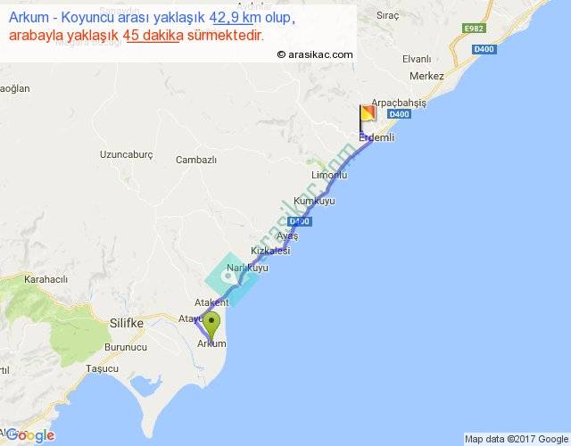 Arkum - Koyuncu arası yaklaşık olarak 90 km/h ile yukarıda belirtilen sürede olup, iki yerin kuş uçuşu uzaklığı (mesafesi) 35'dir. Yolculuk otobüsle 58 dakika sürmektedir.