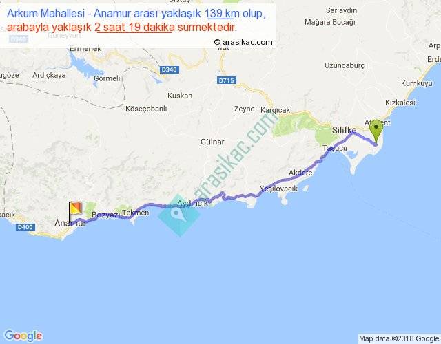 Arkum Mahallesi - Anamur arası yaklaşık olarak 90 km/h ile yukarıda belirtilen sürede olup, iki yerin kuş uçuşu uzaklığı (mesafesi) 112'dir. Yolculuk otobüsle 3 saat 0 dakika sürmektedir.