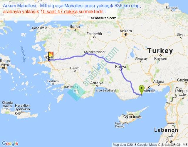 Arkum Mahallesi - Mithatpaşa Mahallesi arası yaklaşık olarak 90 km/h ile yukarıda belirtilen sürede olup, iki yerin kuş uçuşu uzaklığı (mesafesi) 652'dir. Eğer belirtilen yerler arasında uçak seferi var ise bu süre uçakla 1 saat 00 dakika'ya kadar düşebilir. Yolculuk otobüsle 14 saat 1 dakika sürmektedir.