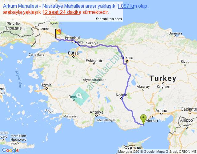 Arkum Mahallesi - Nusratiye Mahallesi arası yaklaşık olarak 90 km/h ile yukarıda belirtilen sürede olup, iki yerin kuş uçuşu uzaklığı (mesafesi) 757'dir. Eğer belirtilen yerler arasında uçak seferi var ise bu süre uçakla 1 saat 09 dakika'ya kadar düşebilir. Yolculuk otobüsle 16 saat 7 dakika sürmektedir.