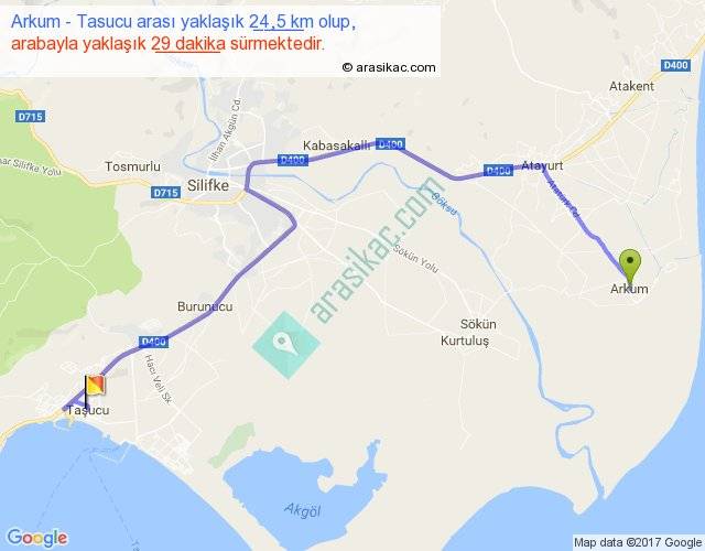 Arkum - Tasucu arası yaklaşık olarak 90 km/h ile yukarıda belirtilen sürede olup, iki yerin kuş uçuşu uzaklığı (mesafesi) 15'dir. Yolculuk otobüsle 37 dakika sürmektedir.