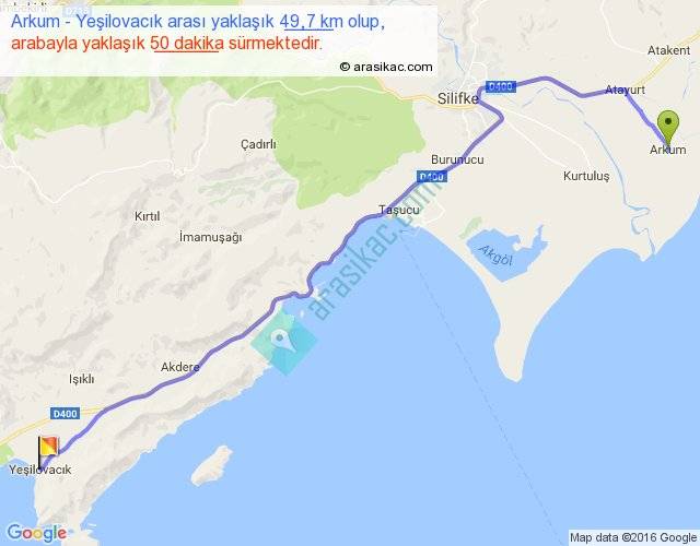 Arkum - Yeşilovacık arası yaklaşık olarak 90 km/h ile yukarıda belirtilen sürede olup, iki yerin kuş uçuşu uzaklığı (mesafesi) 39'dir. Yolculuk otobüsle 1 saat 5 dakika sürmektedir.
