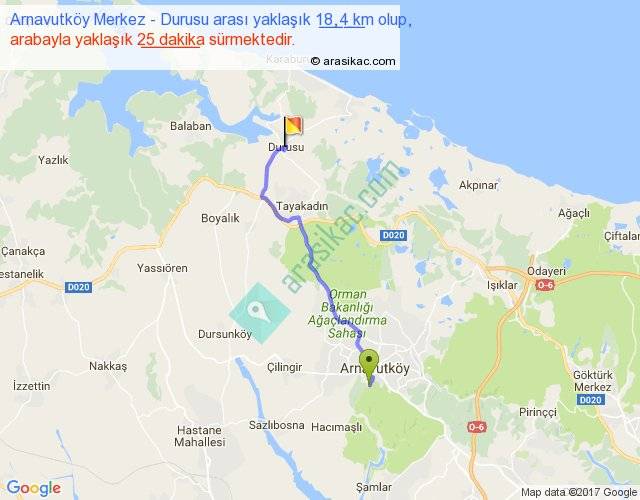 Arnavutköy Merkez - Durusu arası yaklaşık olarak 90 km/h ile yukarıda belirtilen sürede olup, iki yerin kuş uçuşu uzaklığı (mesafesi) 14'dir. Yolculuk otobüsle 32 dakika sürmektedir.