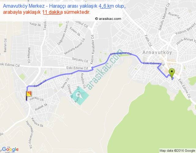 Arnavutköy Merkez - Haraççı arası yaklaşık olarak 90 km/h ile yukarıda belirtilen sürede olup, iki yerin kuş uçuşu uzaklığı (mesafesi) 3'dir. Yolculuk otobüsle 14 dakika sürmektedir.