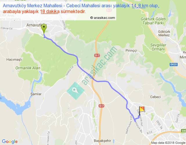 Arnavutköy Merkez Mahallesi - Cebeci Mahallesi arası yaklaşık olarak 90 km/h ile yukarıda belirtilen sürede olup, iki yerin kuş uçuşu uzaklığı (mesafesi) 12'dir. Yolculuk otobüsle 23 dakika sürmektedir.