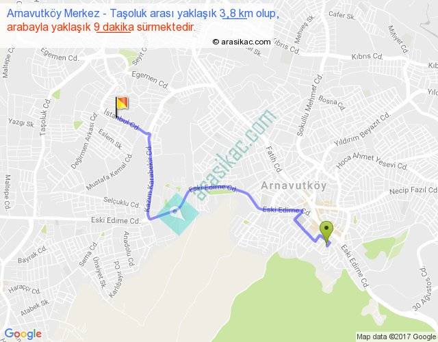 Arnavutköy Merkez - Taşoluk arası yaklaşık olarak 90 km/h ile yukarıda belirtilen sürede olup, iki yerin kuş uçuşu uzaklığı (mesafesi) 3'dir. Yolculuk otobüsle 11 dakika sürmektedir.