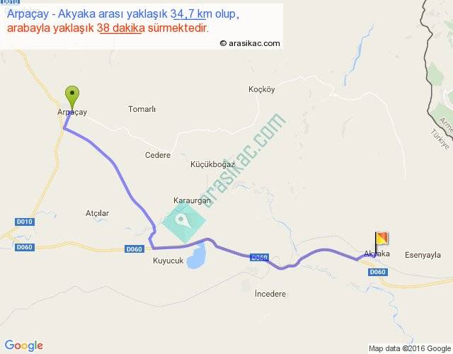 Arpaçay - Akyaka arası yaklaşık olarak 90 km/h ile yukarıda belirtilen sürede olup, iki yerin kuş uçuşu uzaklığı (mesafesi) 27'dir. Yolculuk otobüsle 49 dakika sürmektedir.