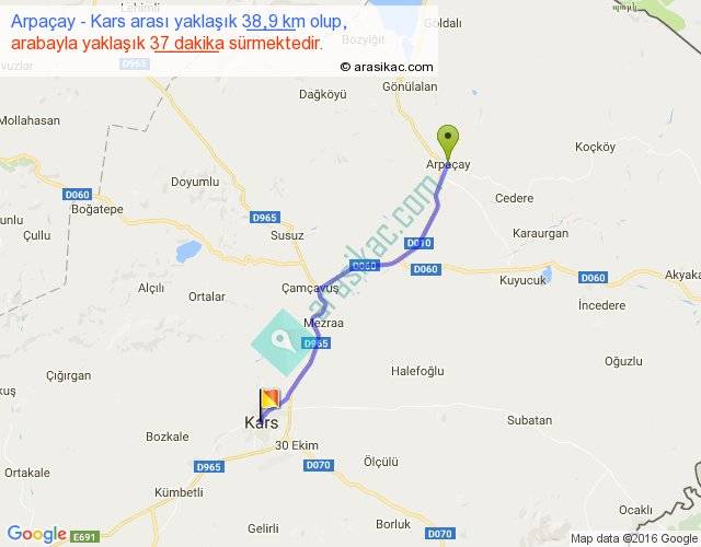 Arpaçay - Kars arası yaklaşık olarak 90 km/h ile yukarıda belirtilen sürede olup, iki yerin kuş uçuşu uzaklığı (mesafesi) 34'dir. Yolculuk otobüsle 48 dakika sürmektedir.