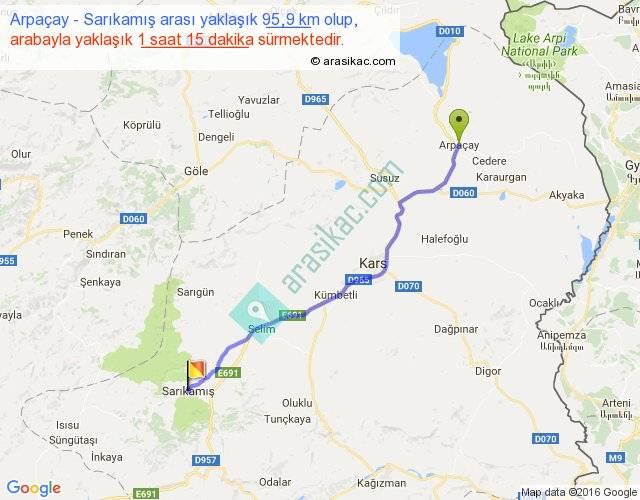 Arpaçay - Sarıkamış arası yaklaşık olarak 90 km/h ile yukarıda belirtilen sürede olup, iki yerin kuş uçuşu uzaklığı (mesafesi) 84'dir. Yolculuk otobüsle 1 saat 37 dakika sürmektedir.