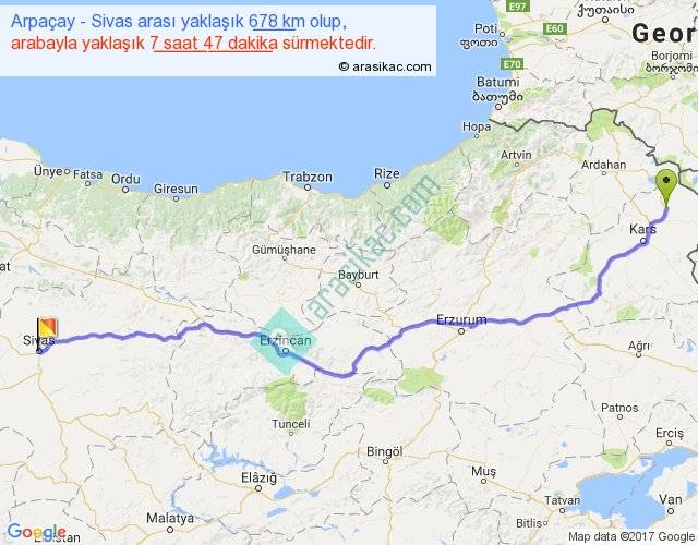 Arpaçay - Sivas arası yaklaşık olarak 90 km/h ile yukarıda belirtilen sürede olup, iki yerin kuş uçuşu uzaklığı (mesafesi) 546'dir. Eğer belirtilen yerler arasında uçak seferi var ise bu süre uçakla 50 dakika'ya kadar düşebilir. Yolculuk otobüsle 10 saat 7 dakika sürmektedir.