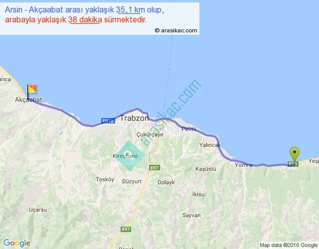 Arsin - Akçaabat arası yaklaşık olarak 90 km/h ile yukarıda belirtilen sürede olup, iki yerin kuş uçuşu uzaklığı (mesafesi) 31'dir. Yolculuk otobüsle 49 dakika sürmektedir.