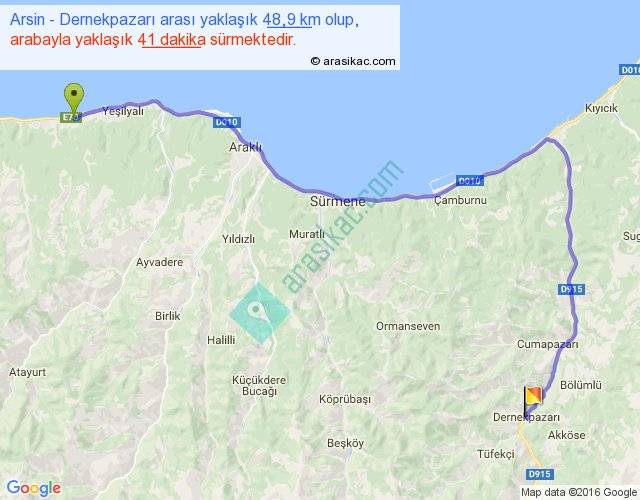 Arsin - Dernekpazarı arası yaklaşık olarak 90 km/h ile yukarıda belirtilen sürede olup, iki yerin kuş uçuşu uzaklığı (mesafesi) 31'dir. Yolculuk otobüsle 53 dakika sürmektedir.