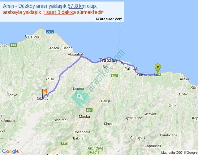 Arsin - Düzköy arası yaklaşık olarak 90 km/h ile yukarıda belirtilen sürede olup, iki yerin kuş uçuşu uzaklığı (mesafesi) 44'dir. Yolculuk otobüsle 1 saat 21 dakika sürmektedir.