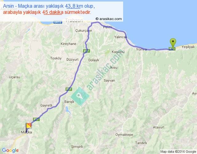 Arsin - Maçka arası yaklaşık olarak 90 km/h ile yukarıda belirtilen sürede olup, iki yerin kuş uçuşu uzaklığı (mesafesi) 31'dir. Yolculuk otobüsle 58 dakika sürmektedir.