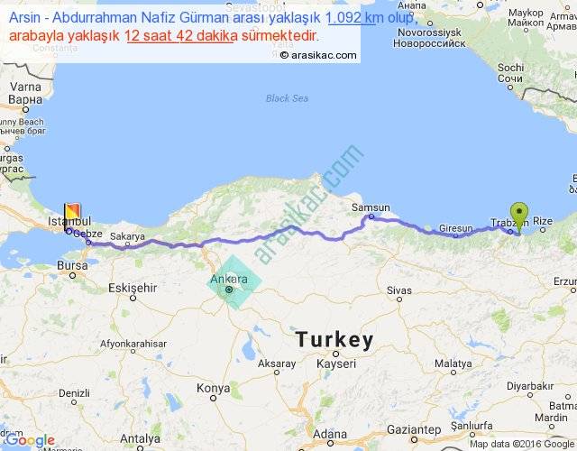 Arsin - Merter arası yaklaşık olarak 90 km/h ile yukarıda belirtilen sürede olup, iki yerin kuş uçuşu uzaklığı (mesafesi) 921'dir. Eğer belirtilen yerler arasında uçak seferi var ise bu süre uçakla 1 saat 25 dakika'ya kadar düşebilir. Yolculuk otobüsle 16 saat 30 dakika sürmektedir.