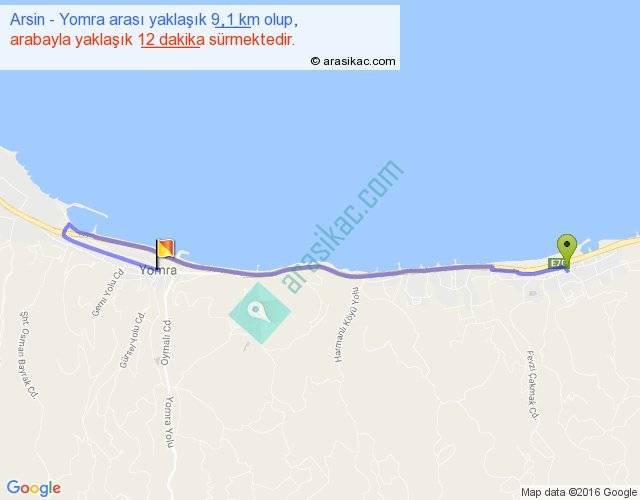 Arsin - Yomra arası yaklaşık olarak 90 km/h ile yukarıda belirtilen sürede olup, iki yerin kuş uçuşu uzaklığı (mesafesi) 6'dir. Yolculuk otobüsle 15 dakika sürmektedir.