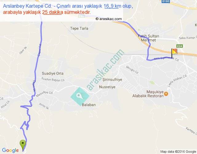 Eğer Arslanbey Kartepe Cd. Çınarlı arası ne kadar yakar (benzin/mazot) diyorsanız, kilometrede 3 ₺ yakan bir aracınız var ise 48, km'de 4 ₺ yakan bir aracınız var ise 64, km'de 5 ₺ yakan bir aracınız var ise 80 ile bu yolculuğu tamamlayabilirsiniz.