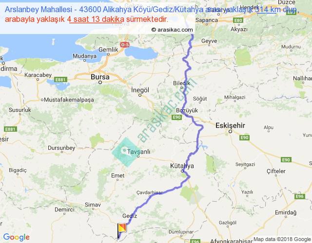 Arslanbey Mahallesi - 43600 Alikahya Köyü Gediz Kütahya arası yaklaşık olarak 90 km/h ile yukarıda belirtilen sürede olup, iki yerin kuş uçuşu uzaklığı (mesafesi) 217'dir. Yolculuk otobüsle 5 saat 28 dakika sürmektedir.