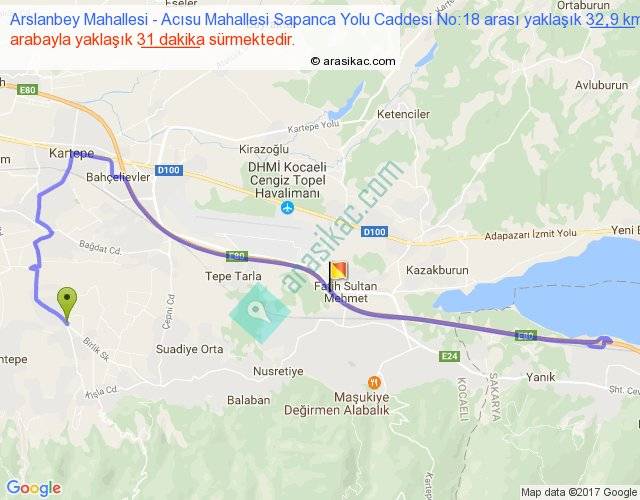 Arslanbey Mahallesi - Acısu Mahallesi Sapanca Yolu Caddesi No:18 arası yaklaşık olarak 90 km/h ile yukarıda belirtilen sürede olup, iki yerin kuş uçuşu uzaklığı (mesafesi) 8'dir. Yolculuk otobüsle 40 dakika sürmektedir.