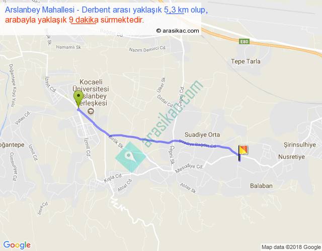 Arslanbey Mahallesi - Derbent arası yaklaşık olarak 90 km/h ile yukarıda belirtilen sürede olup, iki yerin kuş uçuşu uzaklığı (mesafesi) 5'dir. Yolculuk otobüsle 11 dakika sürmektedir.